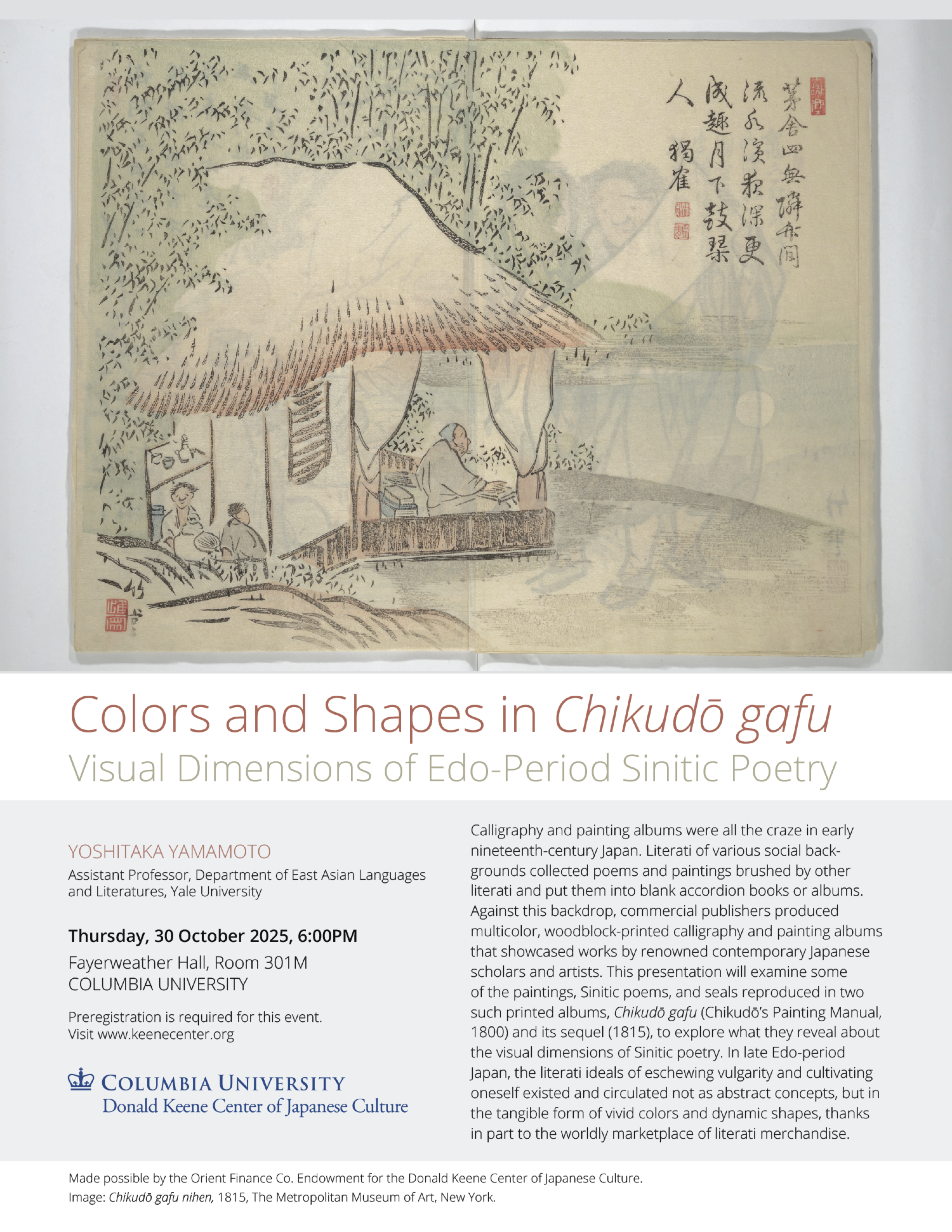 Since 1986, the Donald Keene Center has provided free programs dedicated to introducing Japanese culture, in all its depth and diversity, to new audiences. Combining public outreach with interdisciplinary scholarship, the Center seeks not only to inform but also to inspire. As we celebrate our thirty-fifth anniversary, we look forward to your continued patronage and generous support in helping future generations to experience the richness of cultural discovery. Read more »